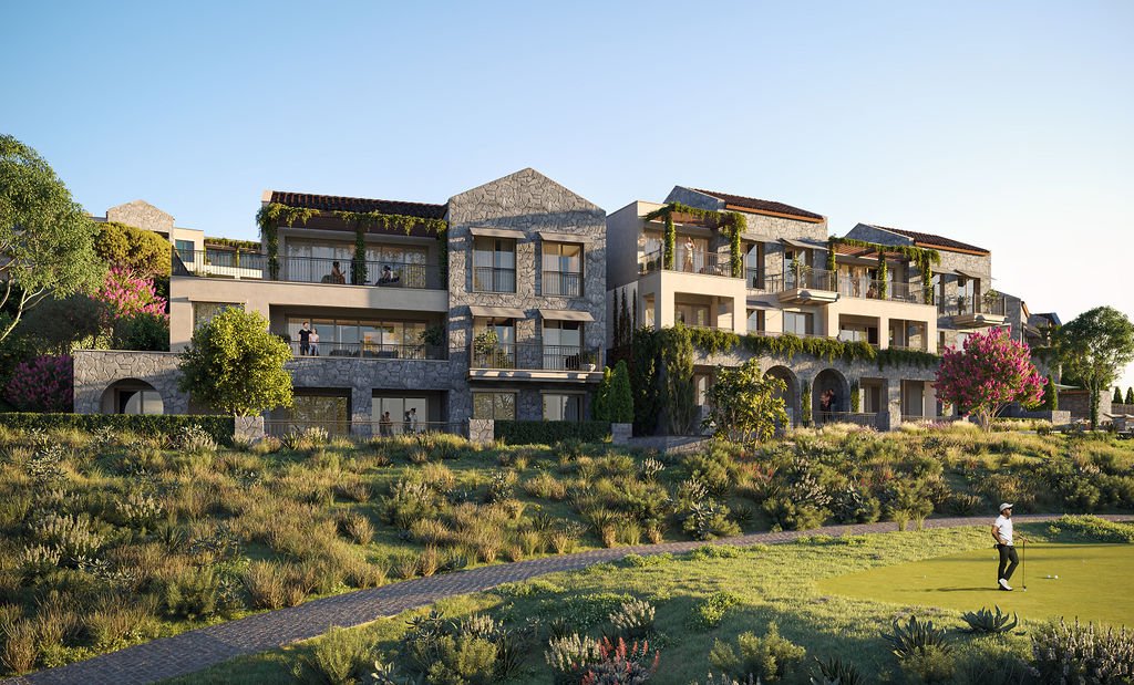 Designed with contemporary architecture inspired by traditional coastal elements, the apartments feature natural materials, open-plan layouts, and spacious terraces that create a seamless connection between indoor and outdoor living. Large windows allow for abundant natural light while framing panoramic views of the sea, fairways, and surrounding hills.